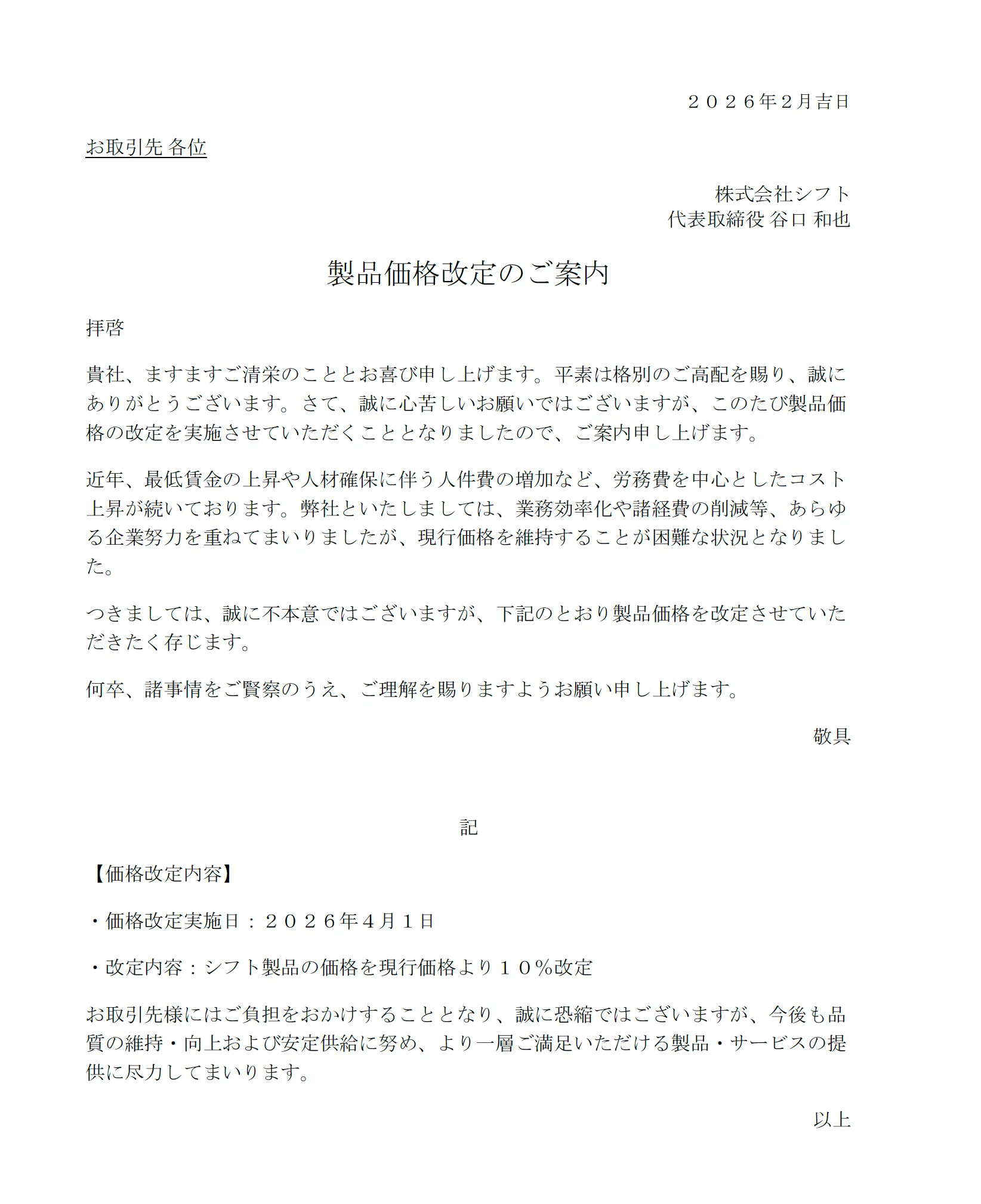 つきましては、誠に不本意ではございますが、下記の通り価格改定を実施させていただきます。